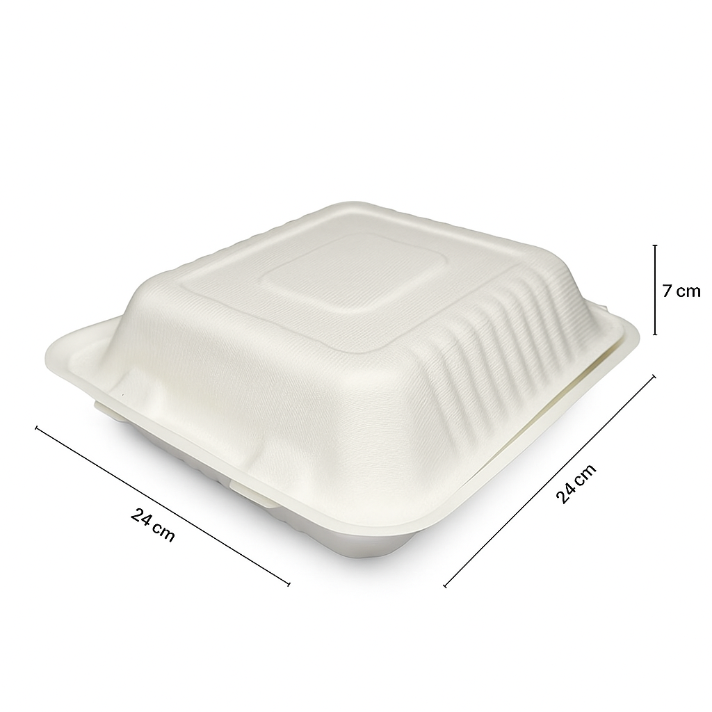 El contenedor almeja sin divisiones 9x9" es la solución ideal para servir platillos completos o de gran tamaño. Hecho de bagazo de caña, es resistente, apto para microondas y completamente compostable. Su diseño práctico mantiene la temperatura y protege la presentación de tus alimentos en cada entrega. Perfecto para restaurantes, cafeterías y negocios que apuestan por empaques funcionales y sustentables.