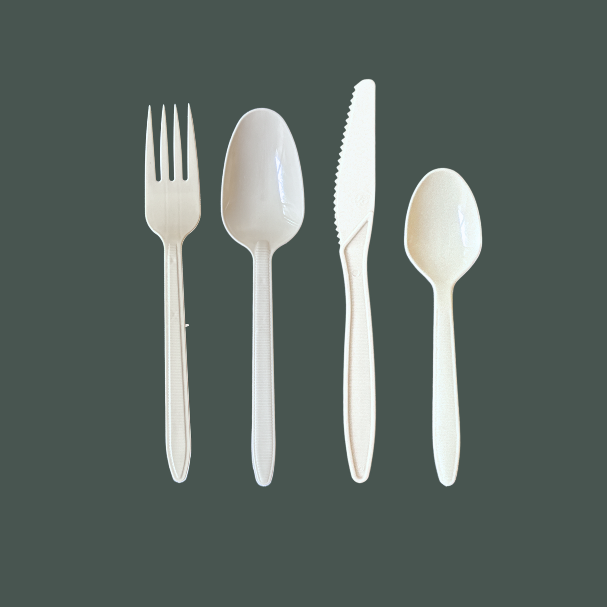 Cubiertos elaborados con fécula de maíz, 100% compostables y resistentes. Disponibles en presentaciones individuales de tenedor, cuchara, cuchillo y cuchara pastelera. Ideales para complementar cualquier platillo en pedidos para llevar, eventos o servicio en sitio con enfoque ecológico.